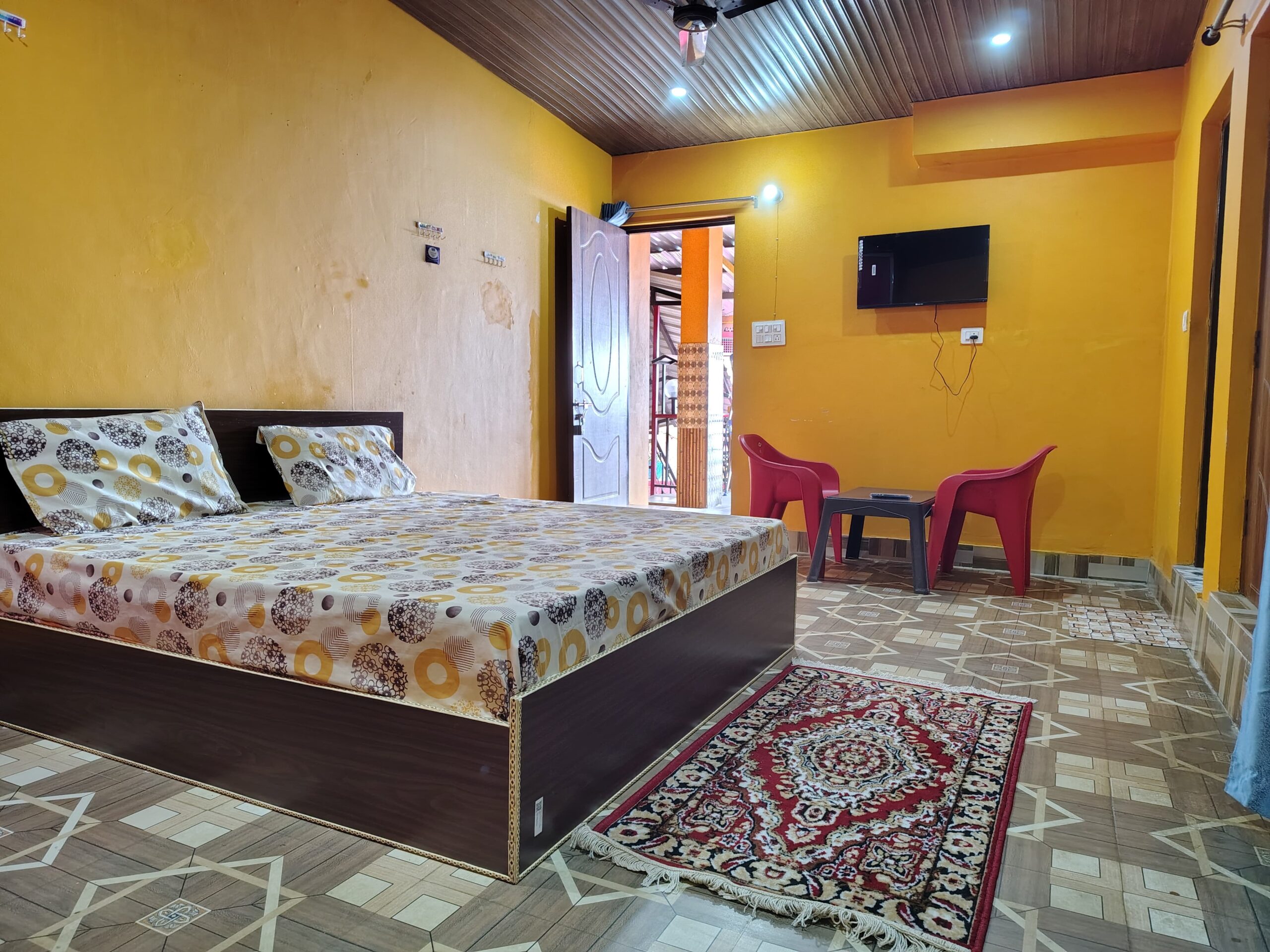 Spacious and warmly decorated with vibrant yellow walls, this room features a comfortable bed, smart TV, cozy sitting area with red chairs, and a patterned rug — ideal for a relaxing stay.