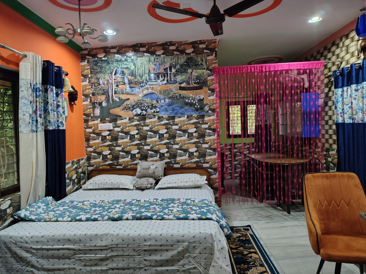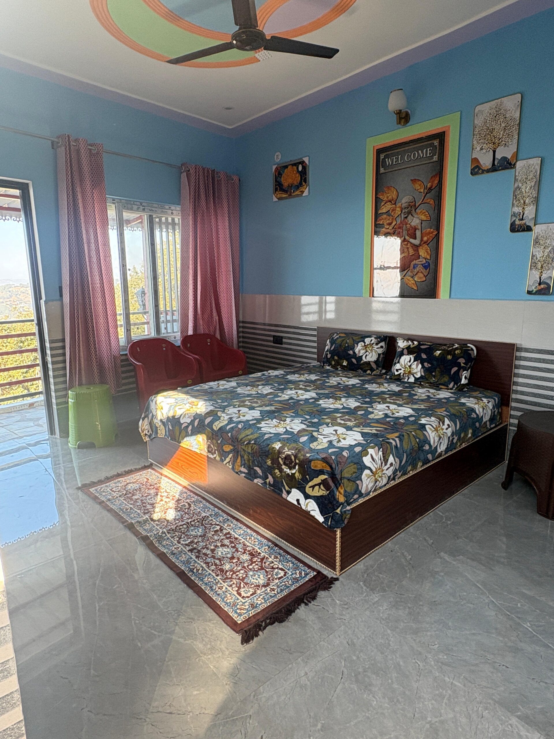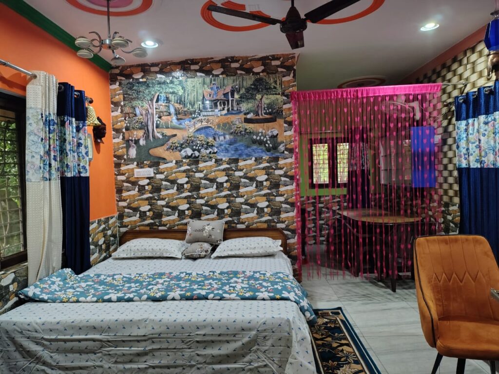 A warm, inviting space with wooden ceiling, traditional Pahadi wall art, comfy double bed, smart TV, and bean bag. Bright natural light makes it perfect for a peaceful homely stay.